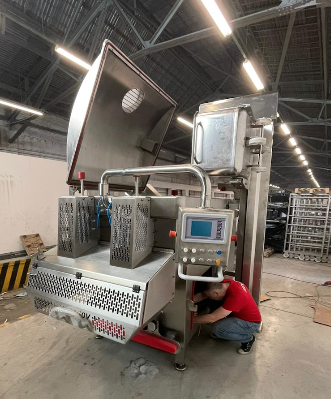 • Una trampilla para descarga de masa de carne en versiones de máquinas con ejes mezcladores ubicados a diferentes niveles.